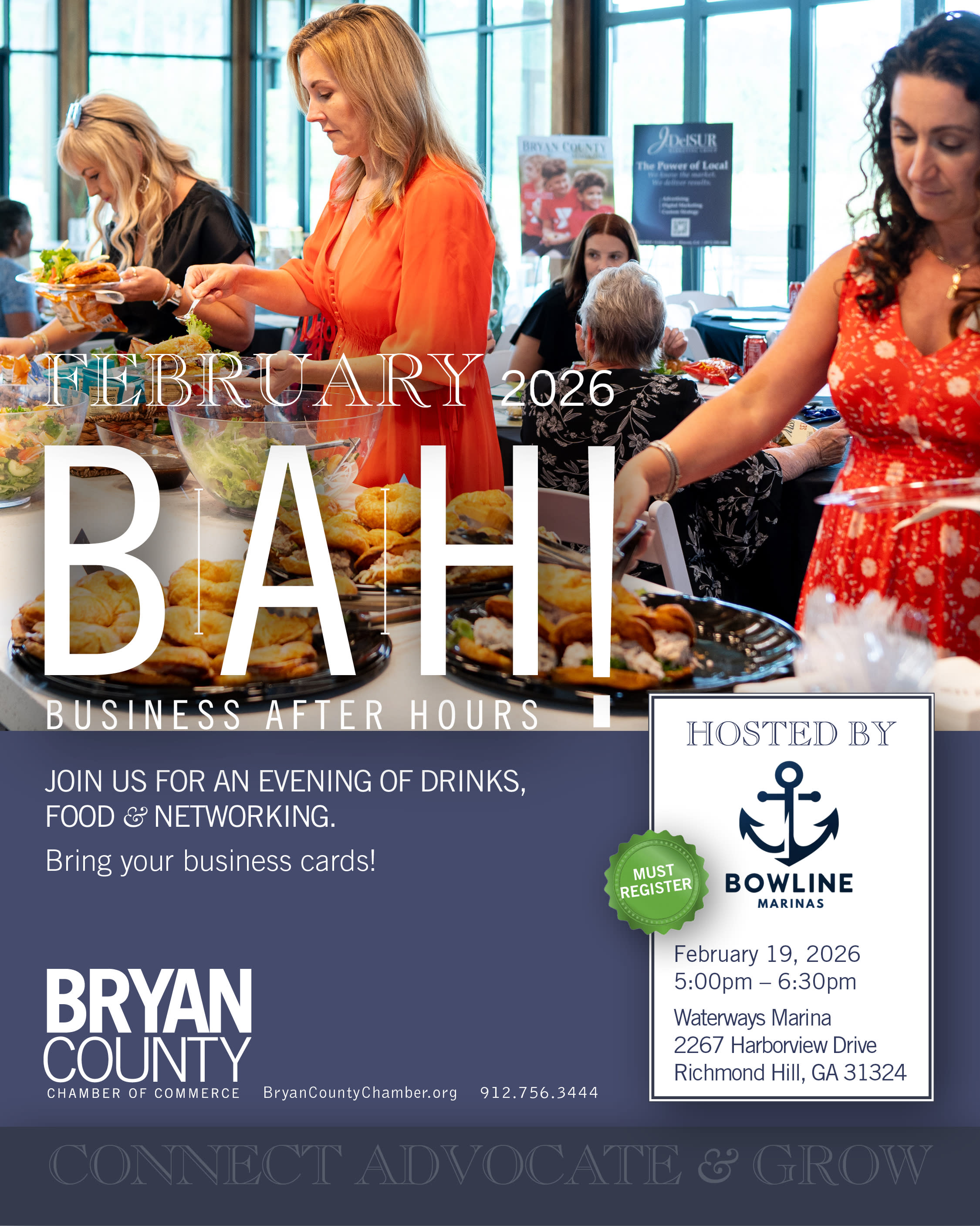 Join us on Thursday, February 19th at Waterways Marina for this after-hours event designed to bring Bryan County Chamber members together in a relaxed setting. Business After Hours (BAH) offers members and their guests a chance to make business and community connections while enjoying light hors d'oeuvres and beverages.
