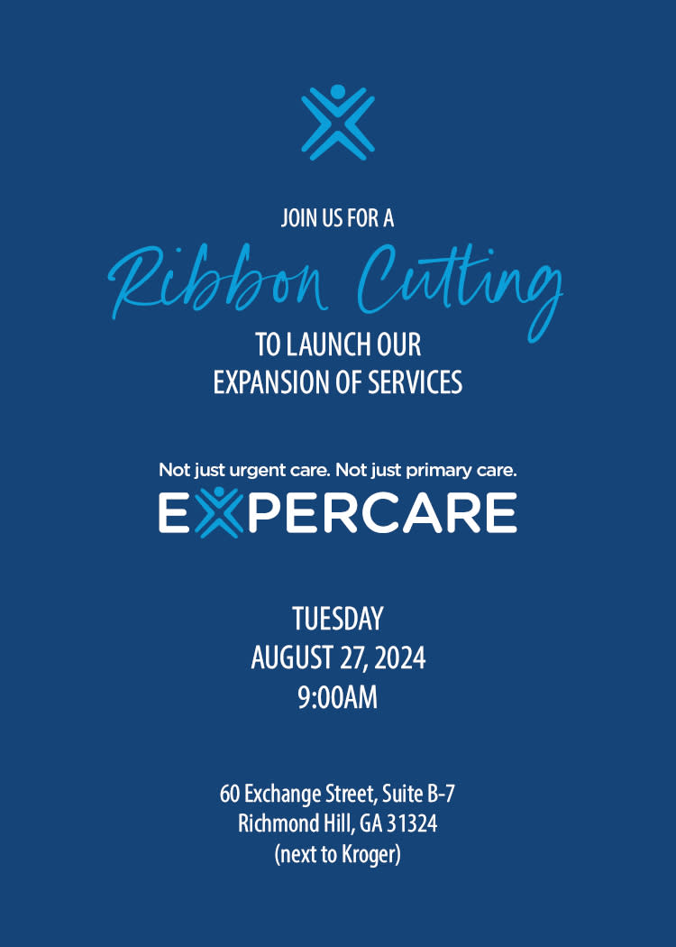 WHAT: Ribbon Cutting for ExperCARE’s Innovative New On-Demand Preventative Healthcare in Richmond Hill, Ga. ExperCARE will host a special ribbon cutting at the company’s Richmond Hill, Ga. office, celebrating an innovative new on-demand preventative healthcare model. This event is free and open to the public. ExperCARE’s new healthcare model is built around expanding access to preventative care and breaking down the silos that traditionally separate diagnostic and preventative services. The company’s expanded on-demand healthcare services are designed to ensure access is never an issue. This patient-centric model is the healthcare model of the future, delivering better outcomes for patients thanks to a wellness-centered approach to healthcare. ExperCARE offers dynamic, team-based, patient-focused care for the whole family, saving patients time and money. The company now provides a full range of walk-in services, seven days a week, in Richmond Hill, offering extended hours for patients with or without health insurance.