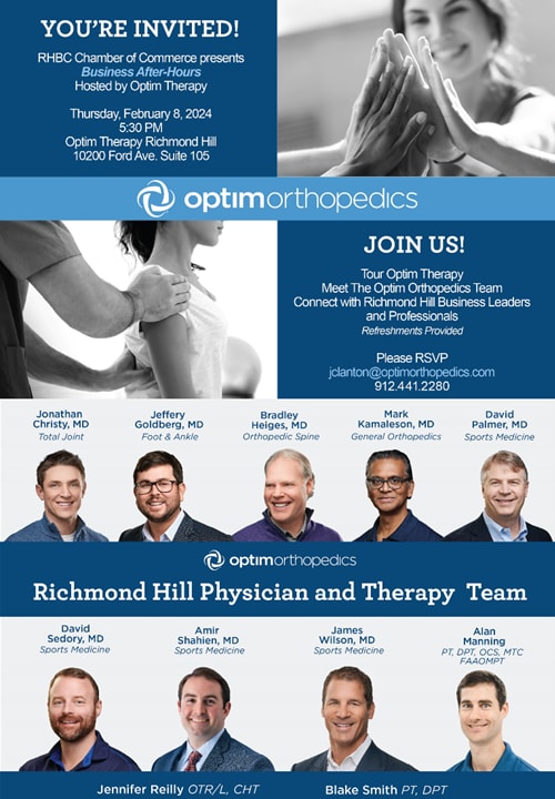 Richmond Hill, GA - The Richmond Hill Bryan County Chamber of Commerce invites you to attend Business After Hours hosted by Optim Orthopedics on February 8, 2024, from 5:30-7:00 PM. The event will take place at the Optim Therapy clinic located at 10200 Ford Ave., Suite 105, Richmond Hill, GA 31324.