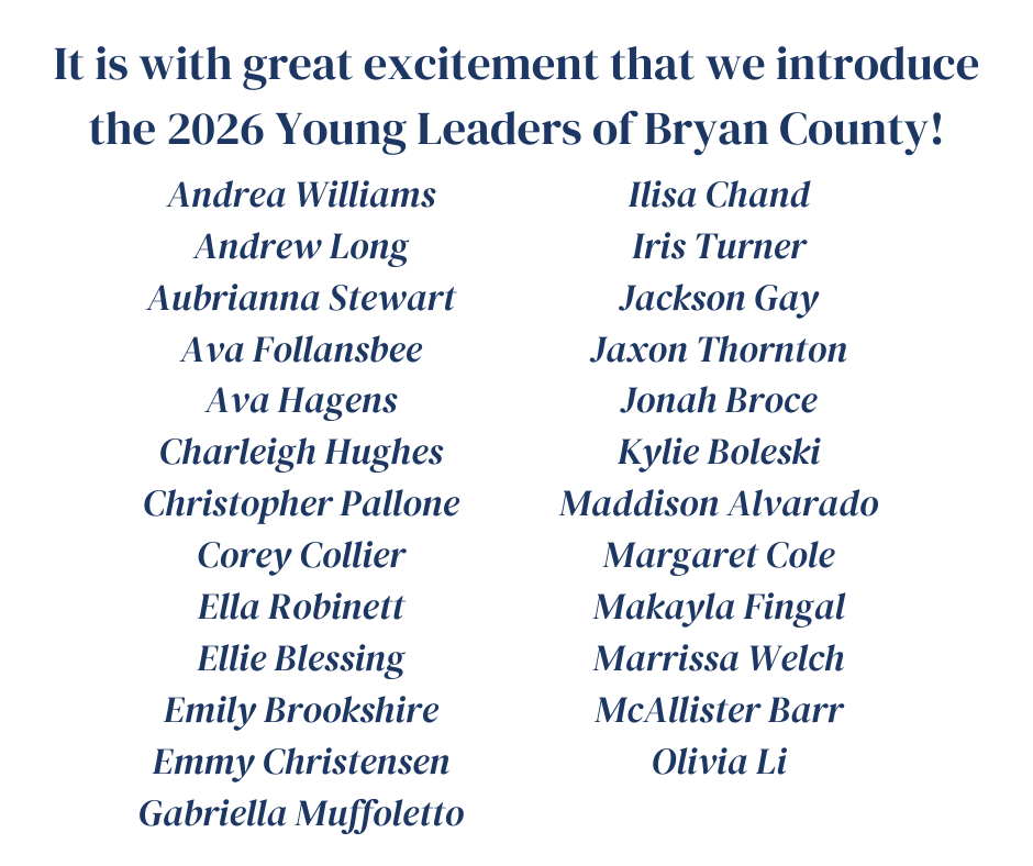 The Young Leaders of Bryan County program is an annual leadership initiative designed to unite a diverse group of high-achieving students and provide a forum to explore the needs, opportunities and future of our community.