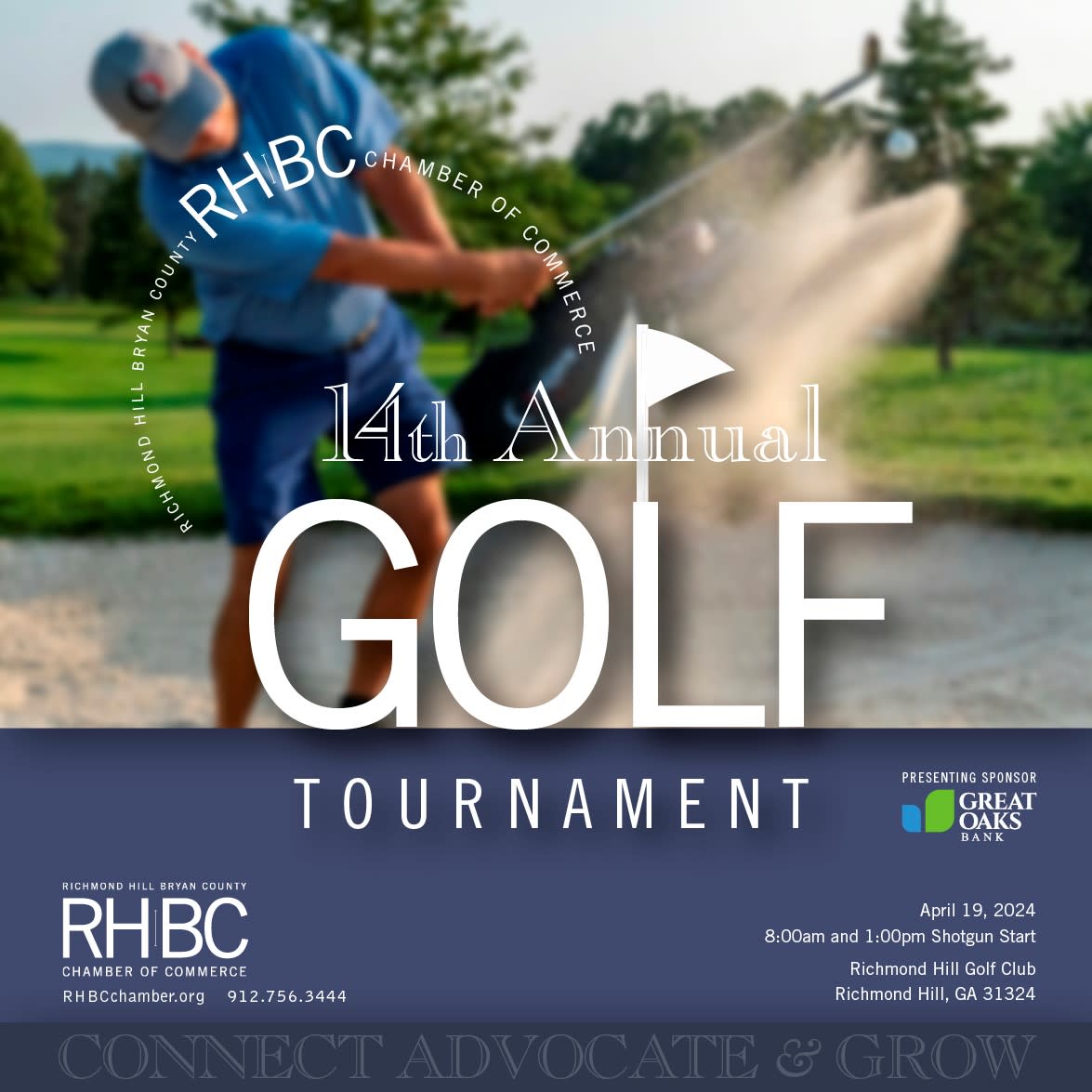 Join us for our 14th Annual Richmond Hill Bryan County Chamber of Commerce Golf Tournament presented by Great Oaks Bank on Friday, April 19, 2024 at Richmond Hill Golf Club.