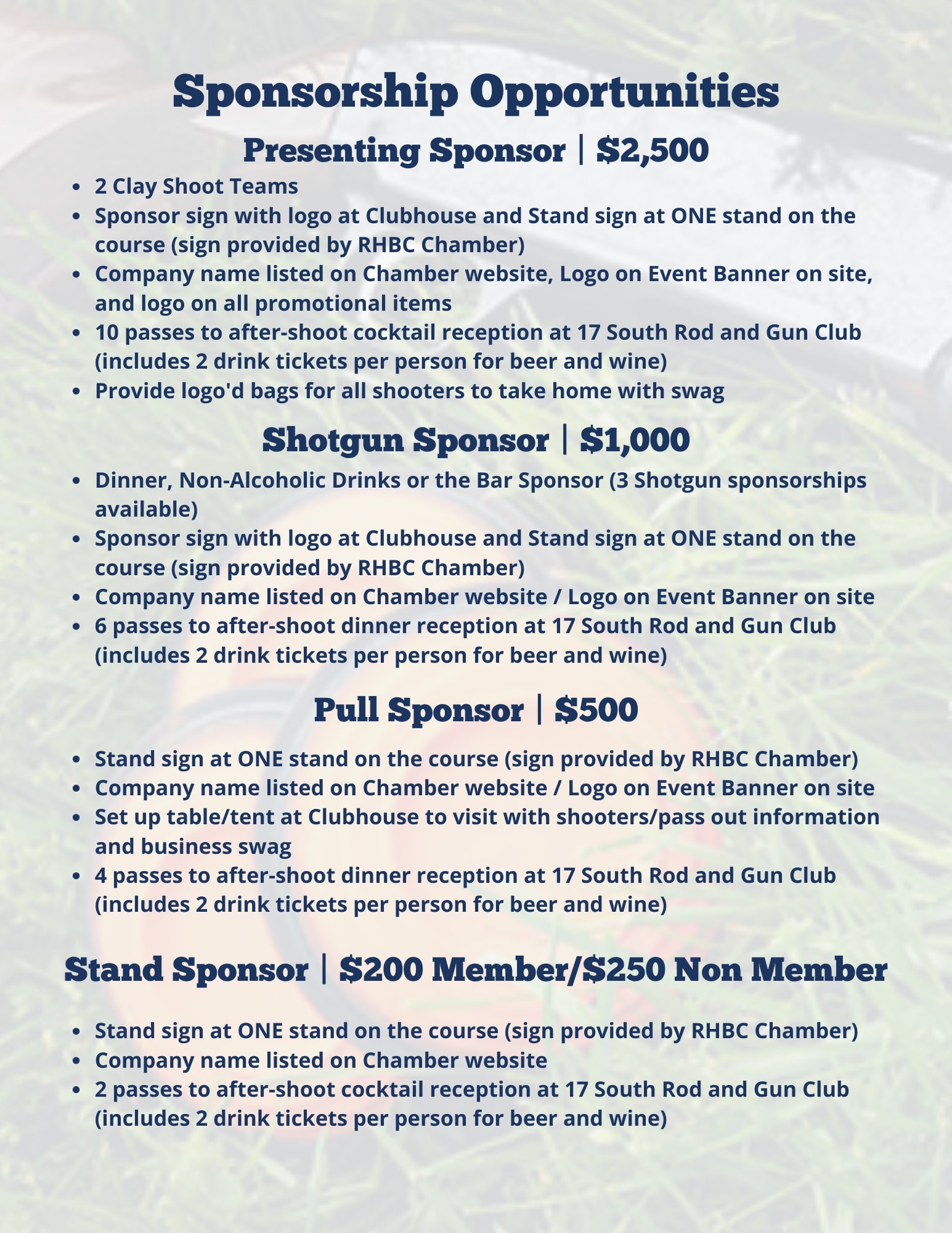 This event features a competitive round of clay shooting, followed by a cocktail reception and raffle. Whether you're an experienced marksman or a complete novice you're sure to have a blast at the RHBCC Clay Shoot Tournament! Dust off your shotguns and get ready to take aim at some networking with fellow business professionals! TEAMS are SOLD OUT!