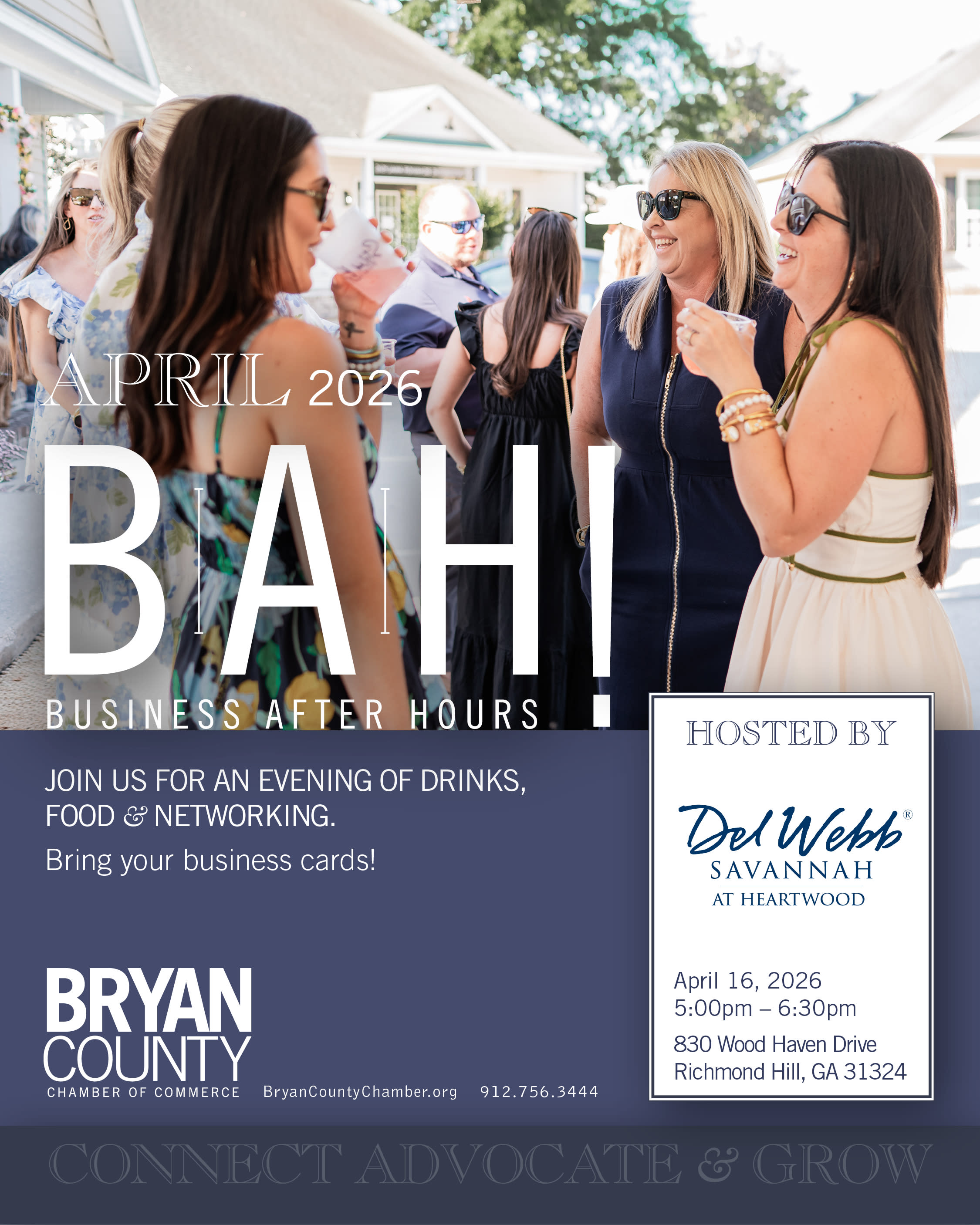 Join us on Thursday, April 16th at Del Webb Savannah at Heartwood for this after-hours event designed to bring Bryan County Chamber members together in a relaxed setting. Business After Hours (BAH) offers members and their guests a chance to make business and community connections while enjoying light hors d'oeuvres and beverages.