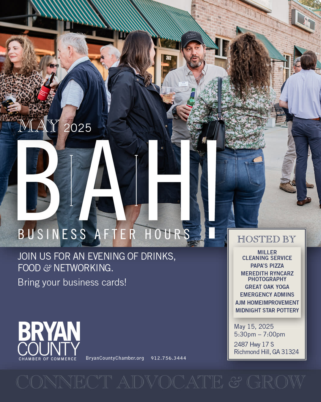 Join us on Thursday, May 15th at Miller Cleaning Service, Papa's Pizza, Great Oak Yoga, Emergency, Admins, Meredith Ryncarz Photography, AJM Homeimprovement, & Midnight Star Pottery for this after-hours event designed to bring Bryan County Chamber members together in a relaxed setting. Business After Hours (BAH) offers members and their guests a chance to make business and community connections while enjoying light hors d'oeuvres and beverages.