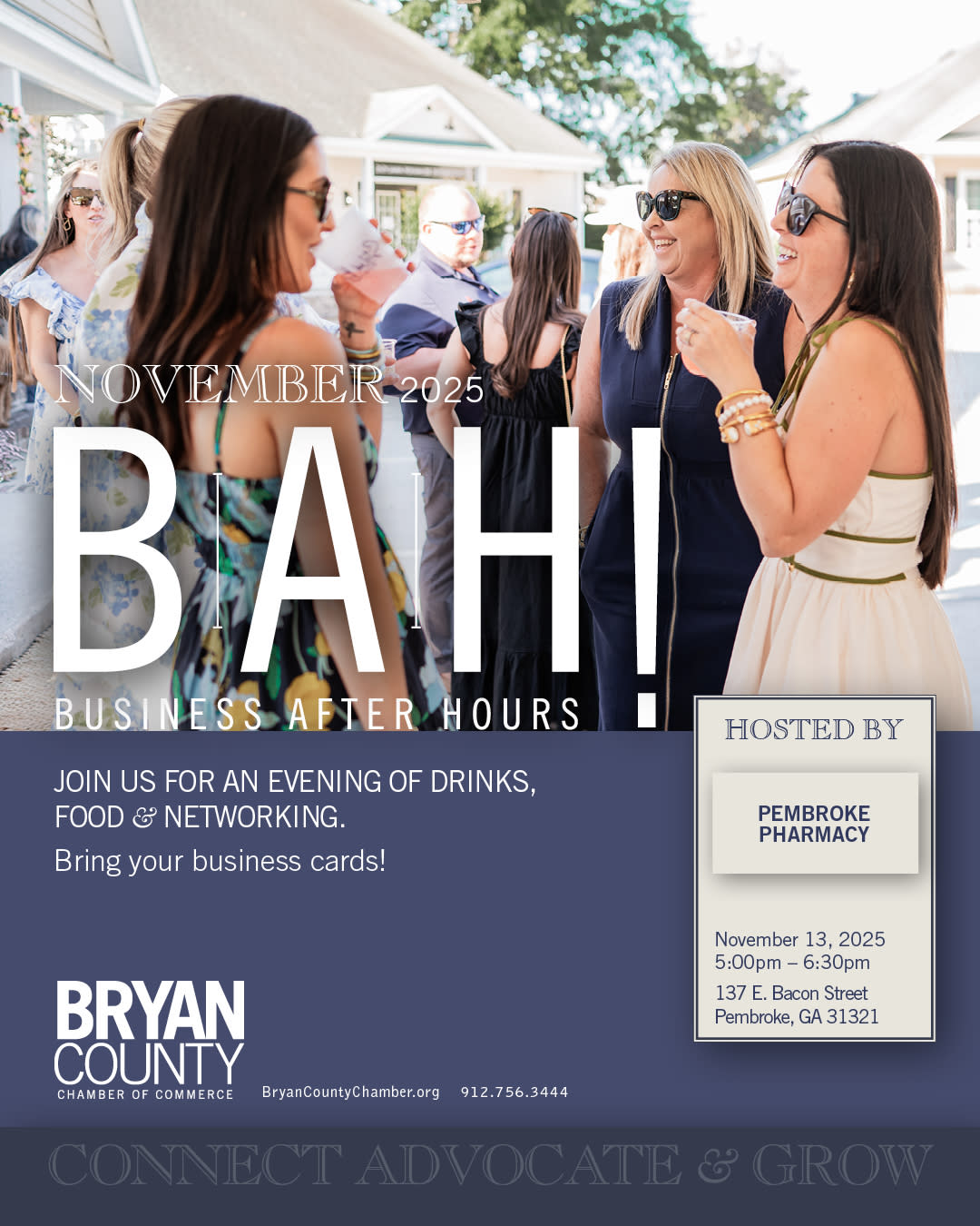 Join us on Thursday, November 13th at Pembroke Pharmacy for this after-hours event designed to bring Bryan County Chamber members together in a relaxed setting. Business After Hours (BAH) offers members and their guests a chance to make business and community connections while enjoying light hors d'oeuvres and beverages.