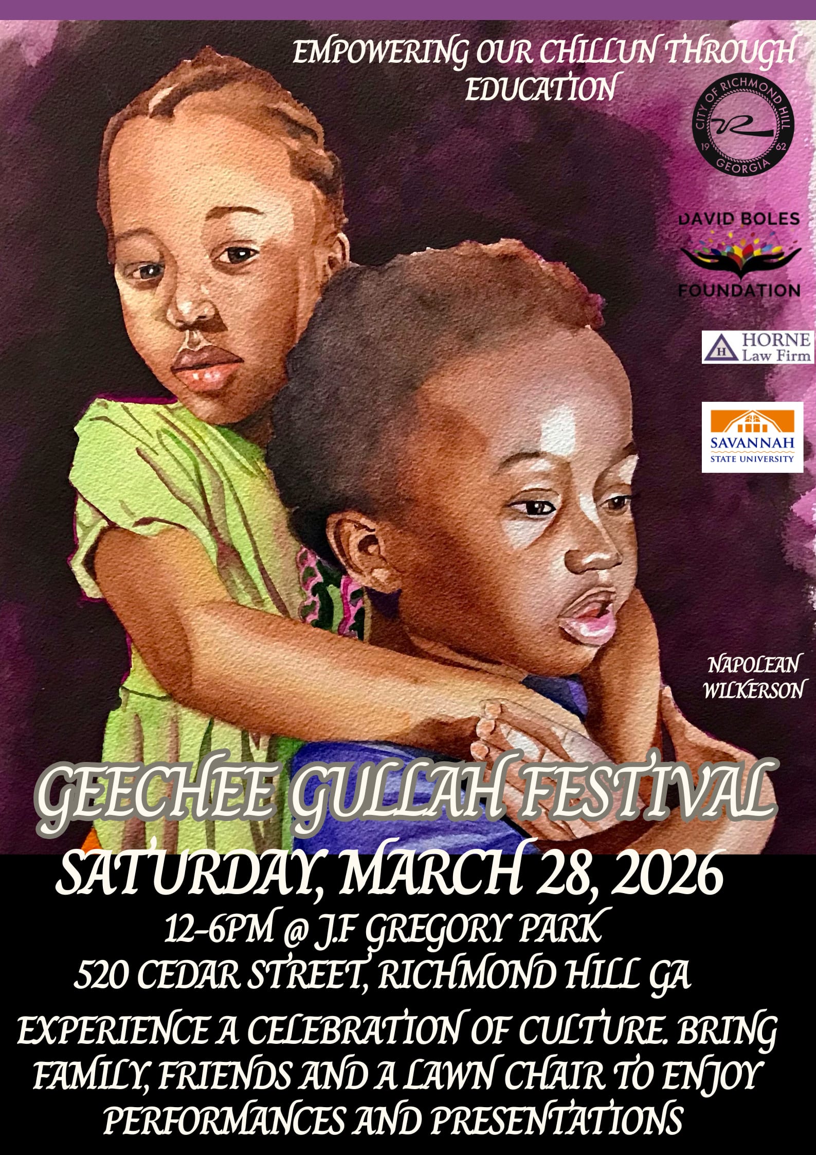 Bring the entire family as we educate, entertain, and feed you in Gullah Geechee style. Learn the story of our culture as the stage show chronologically brings the story to life with enactments, testimonials, songs, and much more. The stage show includes Savannah State University’s concert and Wesleyan Choirs, Hit Man Blues Band, Candice Glover, American Idol winner, and much more. We feature Savannah State University because of the direct impact of this institution on Geechee Gullah culture. The vendors offer authentic Gullah Geechee cuisine, apparel, quilts, baskets, and much more. Join us as the Horne Law Firm, Savannah State University, David Boles Foundation, and the City of Richmond Hill welcome you. Bring your lawn chairs for seating, your curiosity, and your appetite. Saturday, March 28, 2026, at J. F. Gregory Park, noon until 6 PM. Invite your friends via Facebook, and share in other formats.Images
