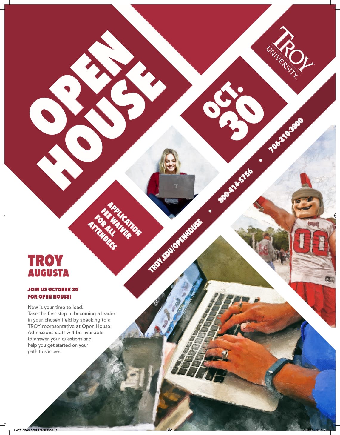 Troy University is hosting an Open House October 30. Our admissions staff can help you decide on a major, or answer questions about financial aid options, credit transfers and admission requirements. All application fees will be waived if you apply during this event. Register to attend: troy.edu/openhouse; walk-ins are welcome.